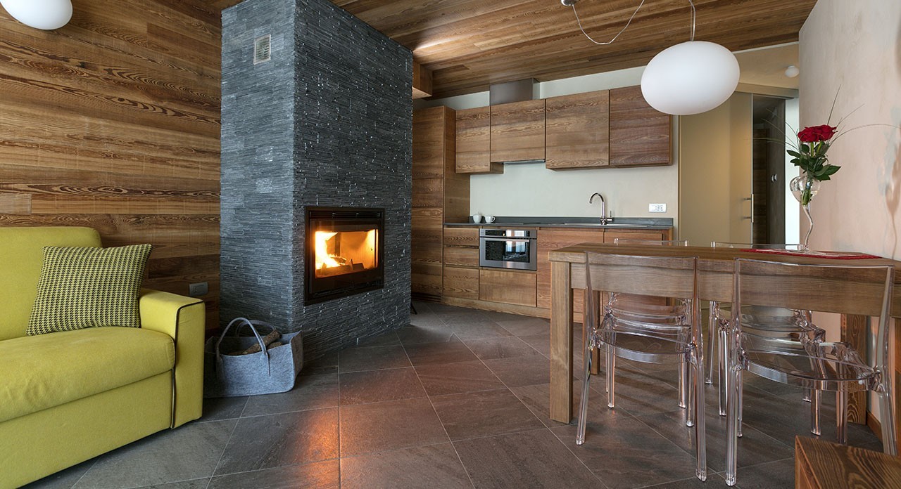 Accogliente appartamento di 60 mq con una camera matrimoniale, una cameretta con divano letto, bagno, angolo cottura e zona soggiorno con il camino centrale.
